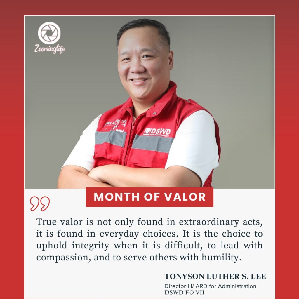 In today’s world, valor is no longer confined to battlefields or grand heroic acts, it lives in everyday decisions, in quiet sacrifices, and in the unwavering commitment to serve others with integrity. For Tonyson Luther S. Lee, Assistant Regional Director for Administration of Department of Social Welfare and Development Field Office VII, valor is found in the systems that protect people, the principles that guide leadership, and the courage to do what is right, even when it is difficult.